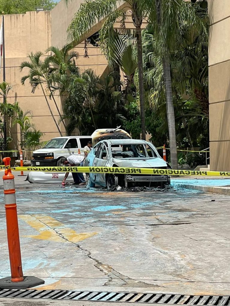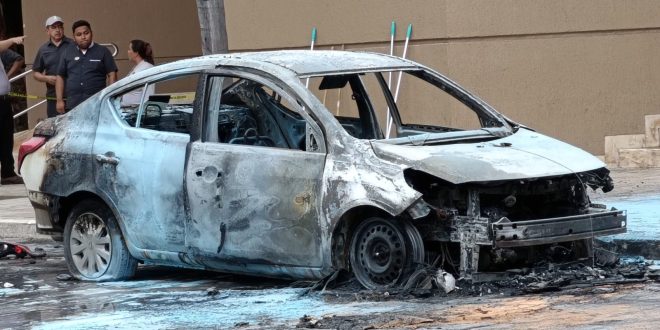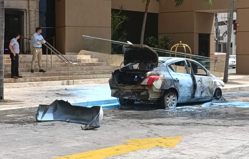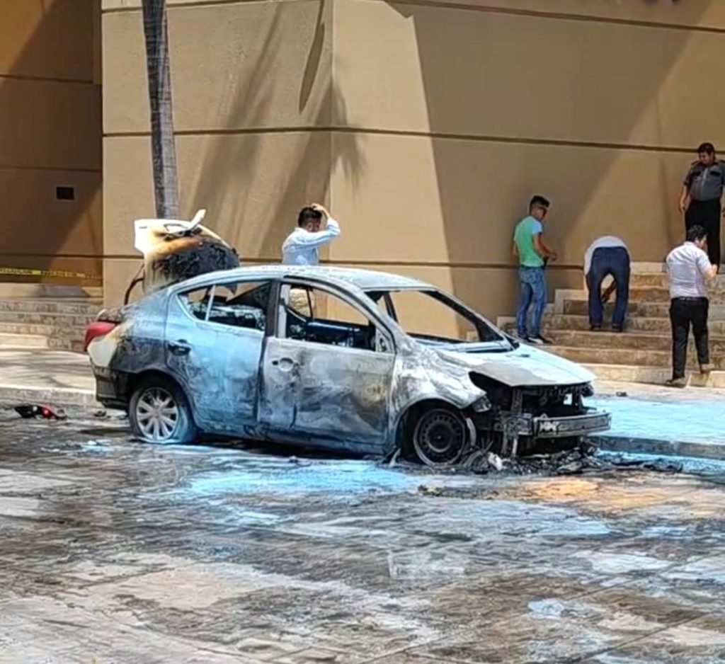 Mérida, Yuc., a 01 de julio 2024.- Completamente en cenizas quedó un automóvil habilitado como taxi del Frente Único de Trabajadores del Volante que se incendió justo en la entrada del hotel Hyatt Regency en la calle 60 con avenida Colón.