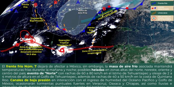 La masa de aire frio que dejó a su paso el frente frio No. 7, se mantendrá sobre la península de Yucatán, generando cielo parcialmente nublado con probabilidad de lloviznas en el norte de Yucatán, sur de Campeche, así como en el sur de Quintana Roo. Las temperaturas serán cálidas a calurosas durante el día y de templadas al amanecer, con viento del norte-noroeste de 15 a 20 km/h y rachas de hasta 40 km/h.