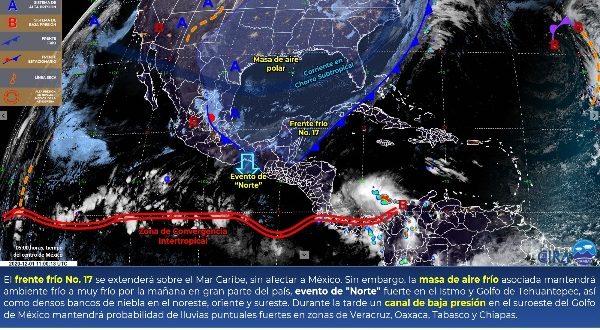 Se prevé que la masa de aire frío que impulsó al frente frío No.17 continúe predominando sobre la región, manteniendo condiciones de tiempo estable con cielo medio nublado, sin embargo la probabilidad de lluvias será escasa. El ambiente será cálido durante el día y fresco a templado al amanecer, especialmente en sectores del sur de Yucatán, noreste de Campeche y el centro de Quintana Roo, con vientos dominantes del norte-noreste de 15 a 25 km/h y rachas mayores a 40 km/h en costas.