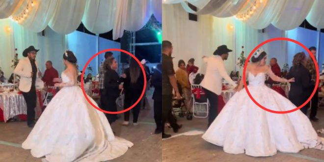Como si esperara que nadie se diera cuenta, la mujer se aproxima a la novia y comienza a pisar su vestido, simulando que sigue bailando, acto que no pasó desapercibido por la joven, quien se percató del movimiento.