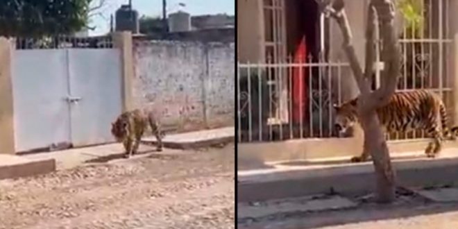 Entre gritos, mujeres de Tecuala, Nayarit, advirtieron de un tigre de bengala, quien se paseaba “libremente” por la calle.