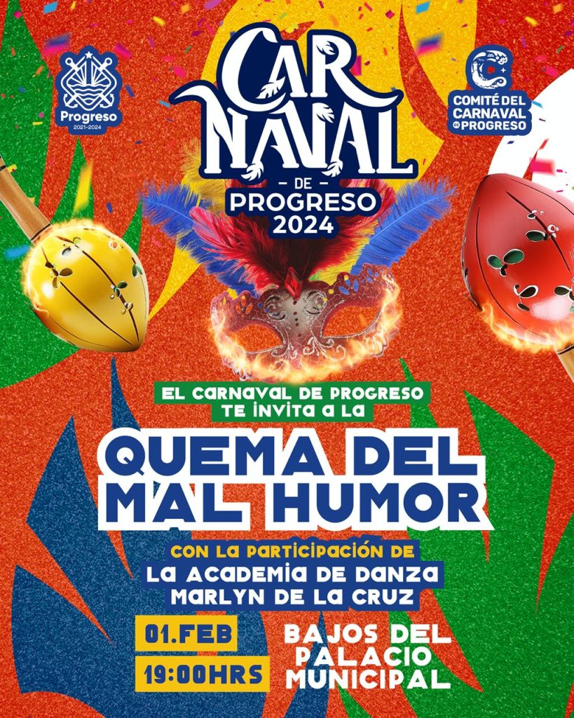 Progreso, Yucatán a 31 de enero de 2024. Con la Quema del Mal Humor y el Paseo de Gallo este jueves 1 de febrero, el puerto de Progreso iniciará una de sus máximas fiestas: el Carnaval 2024, el cual resaltará la cultura, artesanía, gastronomía y turismo, así como los ritmos latinos de seis países: Brasil, Colombia, Jamaica, Puerto Rico, Cuba y México, así lo destacó la presidenta del Comité organizador, Alejandra Castilla Blanco.