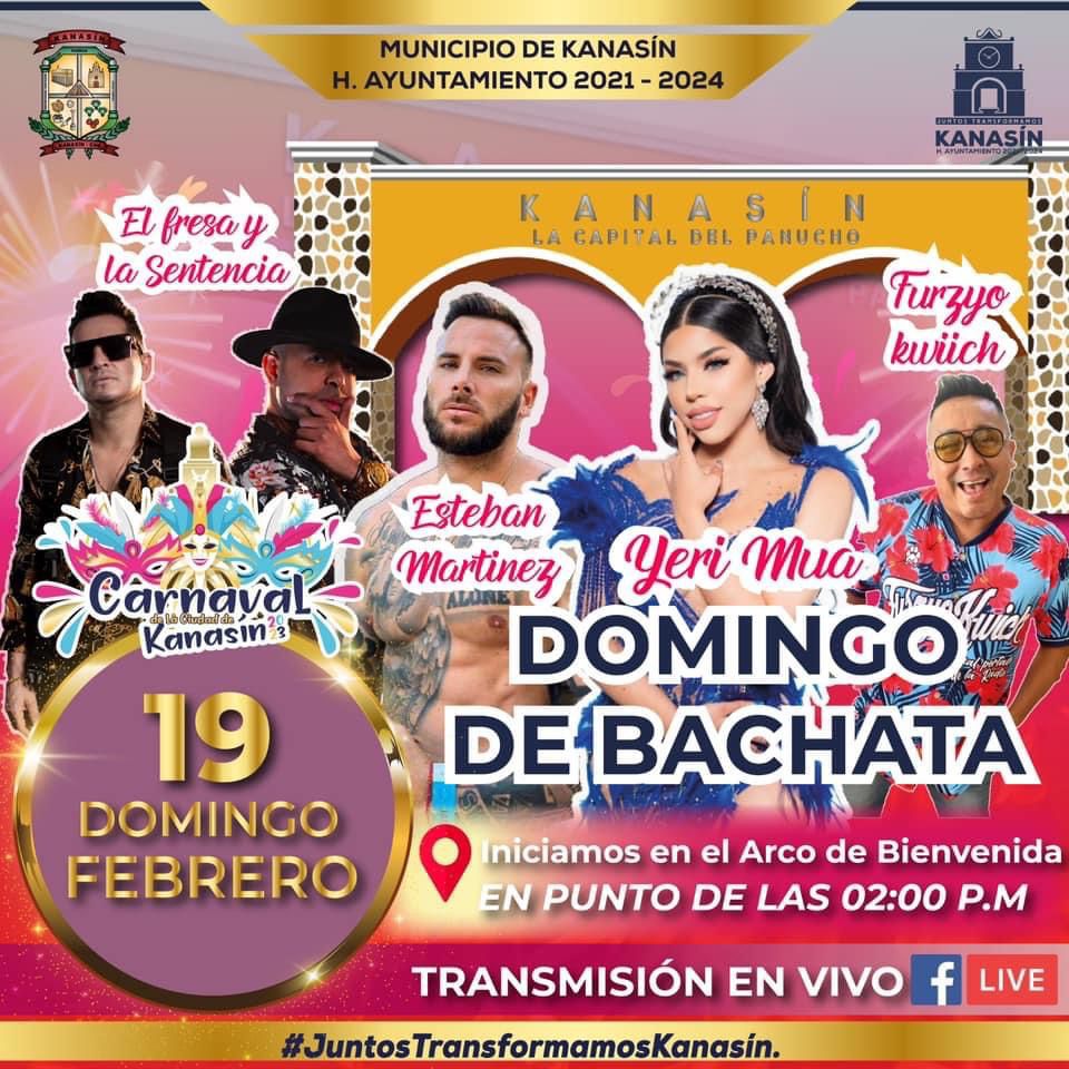 El domingo 19 de febrero será de “Bachata” y el desfile iniciará desde las 14:00 hrs. Este es uno de los días donde se espera el mayor número de visitas y para el paseo se espera la participación de la influencer Yeri Mua y del deportista y modelo Esteban Martínez. En la música estará El Fresa y La Sentencia.