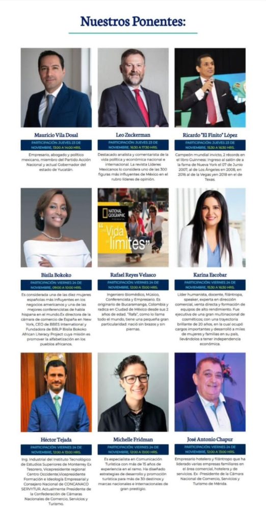 El programa de actividades correspondiente al día 23 de noviembre, las ponencias estarán a cargo de Mauricio Vila Dosal, Gobernador del Estado de Yucatán; Leo Zuckerman, destacado analista y comentarista de la vida política y económica nacional e internacional; Ricardo “El Finito” López, campeón mundial invicto, 2 récords en el libro Guinness: Ingreso al salón de a la fama de Nueva York el 07 de Junio 2007, al de Los Ángeles en 2008, en 2016 al de la Vegas y en 2018 en el de Texas.