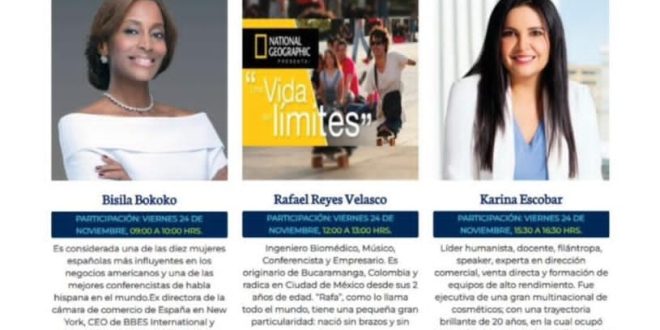 Para el viernes 24, las conferencias serán las de Bisila Bokoko, considerada una de las diez mujeres españolas más influyentes en los negocios americanos y una de las mejores conferencistas de habla hispana en el mundo. Ex directora de la cámara de comercio de España en New York, CEO de BBES International; Rafael Reyes Velasco, ingeniero biomédico, músico, conferencista y empresario. “Rafa”, como lo llama todo el mundo, tiene una pequeña gran particularidad: nació ́ sin brazos y sin piernas; Karina Escobar, líder humanista, docente, filántropa, speaker, experta en dirección comercial, venta directa y formación de equipos de alto rendimiento.
