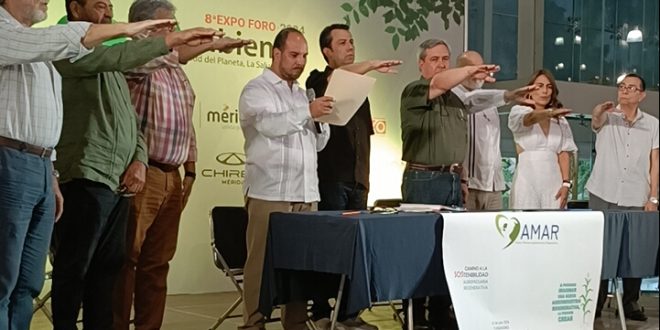 Mérida, Yucatán, 13 de julio 2024.- Empresarios, productores y académicos del sector agroalimentario de varios estados del país, tomaron protesta en esta ciudad capital, como parte del primer Consejo Directivo de la Alianza Mexicana Agroalimentaria Regenerativa (A.M.A.R.), que tiene como objetivo fomentar y desarrollar modelos de producción agropecuarios regenerativos que sean económicamente rentables, técnicamente eficientes, socialmente justos y ambientalmente responsables.
