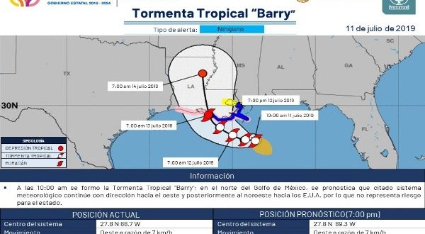 Mérida, Yucatán, 11 de julio de 2019.- La tormenta tropical Barry no representa riesgo alguno para el estado, por su lejanía y pronóstico de trayectoria, informó la Coordinación Estatal de Protección Civil (Procivy), sobre el fenómeno que se formó esta mañana, al norte del Golfo de México.