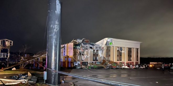 Varias viviendas y otros edificios sufrieron daños en la tormenta, incluido un hotel Hampton Inn que sufrió daños estructurales significativos.