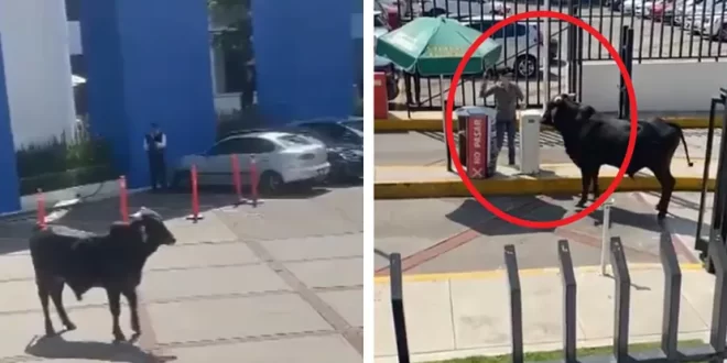 En las imágenes se observa al toro de tamaño mediano dar algunos pasos hacia atrás como para embestir, mientras un hombre que al parecer es trabajador lo trata de atraer.