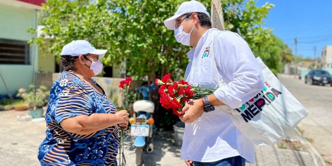 Mérida, Yucatán, 10 de mayo de 2021.- El candidato a diputado local por el V Distrito por el Partido Revolucionario Institucional (PRI), Jorge Armando García “Totocho”, sigue visitando las colonias, hoy en el Día de las Madres en su recorrido por la Nueva Pacabtún y el fraccionamiento Nueva Mayapán consintió a las vecinas con un detalle de claveles rojos.