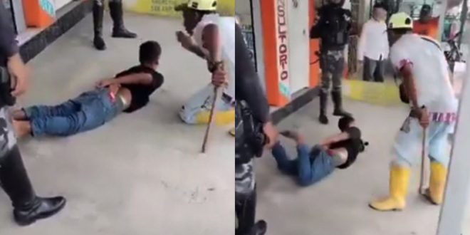 ¡Justicia! Un padre avergonzado por la actitud de su hijo, que fue detenido por el delito de robo, llegó hasta el lugar con una tabla en la mano para darle una lección. “Trabaja”, le gritó al joven malandro que se encontraba esposado y en el suelo.