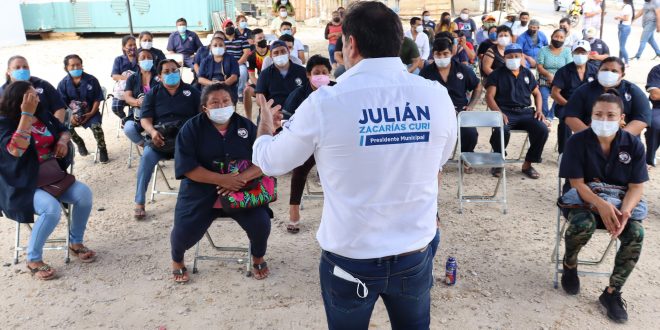 Progreso, Yucatán 15 de mayo de 2021.- Hombres y mujeres que laboran en la congeladora y empacadora de productos del mar “Goodmar”, de la empresa “Pulpesmar”, así como de la congeladora y fábrica de hielo “Promarmex” recibieron esta mañana al candidato del Partido Acción Nacional (PAN) por la presidencia municipal de Progreso, Julián Zacarías Curi, quien agradeció la apertura para escucharlo y conocer los proyectos con los que busca mejorar las condiciones para ellos, su familia y su fuente de empleo.