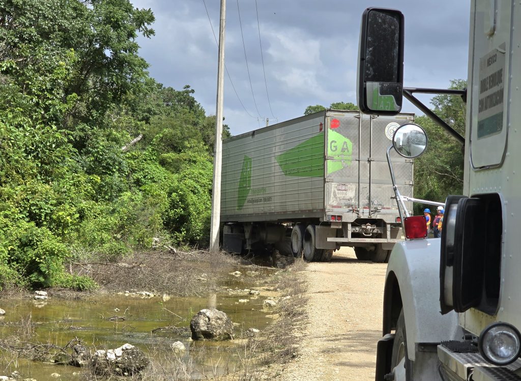 Kinchil, Yuc. a 23 de octubre 2024.- Un tractocamión de caja seca paso serios apuros al atascarse fuera del camino que conduce a la granja “Amaris 2” cerca del kilómetro 61, de la vía Mérida-Celestún, la mañana de anteayer.