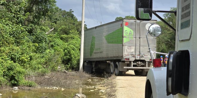 Kinchil, Yuc. a 23 de octubre 2024.- Un tractocamión de caja seca paso serios apuros al atascarse fuera del camino que conduce a la granja “Amaris 2” cerca del kilómetro 61, de la vía Mérida-Celestún, la mañana de anteayer.