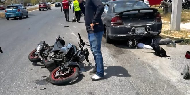 MÉRIDA, Yuc., 22 de mayo 2025.- Un dramático accidente se registró este martes en el Periférico Oriente de Mérida, a la altura del fraccionamiento Polígono 108, cuando tres personas que viajaban en motocicletas colisionaron contra un tráiler que ingresaba a las instalaciones de la fábrica de jamones IASA.