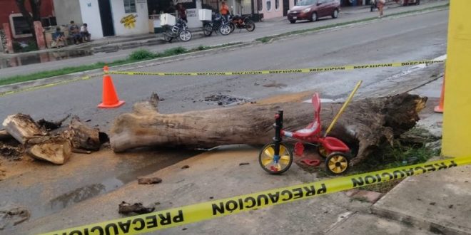 Los hechos ocurrieron como a las 5 de la tarde, cuando el niño daba un paseo a bordo de un triciclo acompañado de su mamá, pero al llegar a la calle 9 entre 26-A y 26-B de la colonia San Francisco un gran tronco seco de un árbol le cayó encima a consecuencia de la lluvia.