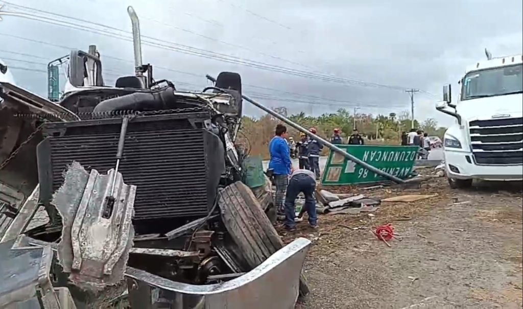 MÉRIDA, Yuc., 07 de abril 2025.- Completamente desbaratado quedó un tráiler luego de estrellarse contra la base metálica de un señalamiento “de bandera” en la zona sur del Anillo Periférico de Mérida.