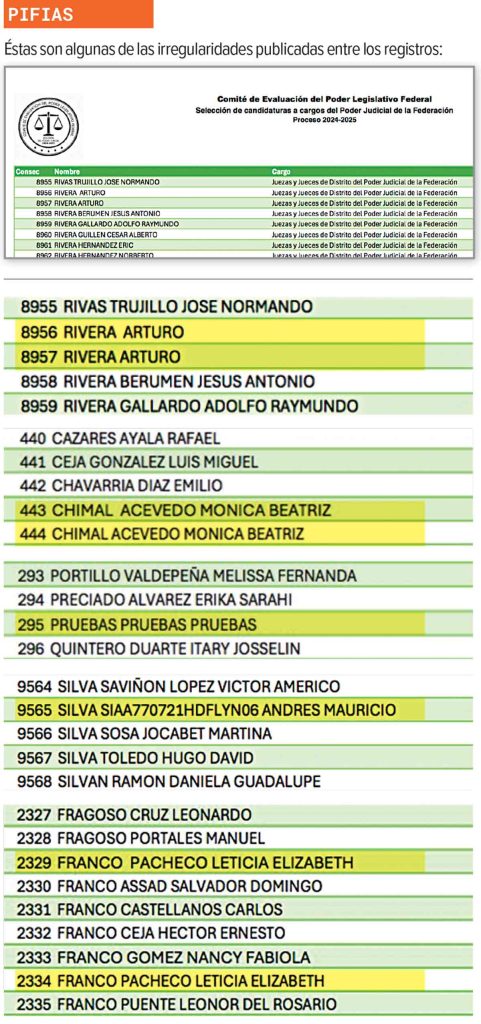 Excélsior detectó que el documento de 149 páginas presenta al menos una treintena de nombres duplicados, además de registrar aspirantes con un solo apellido y contiene errores al incorporar textos falsos.