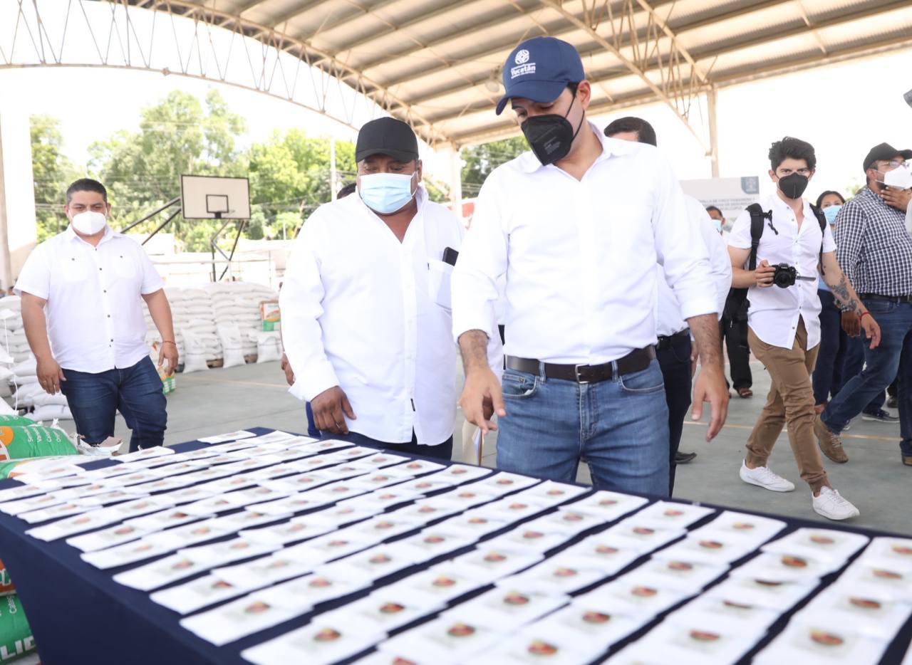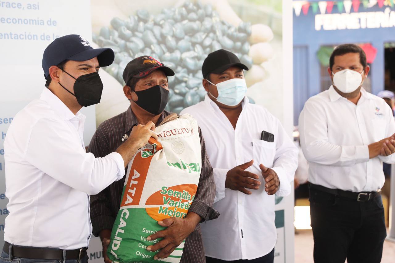 Al interior del domo del parque principal de esta demarcación, el Gobernador entregó 400 sacos de semilla de frijol Jamapa y 150 paquetes de semilla de chile habanero de la variedad Kisín, que en esta población benefician a un total de 550 familias, cuyas siembras resultaron dañadas por los fuertes vientos y lluvias que trajo el fenómeno natural en agosto pasado.