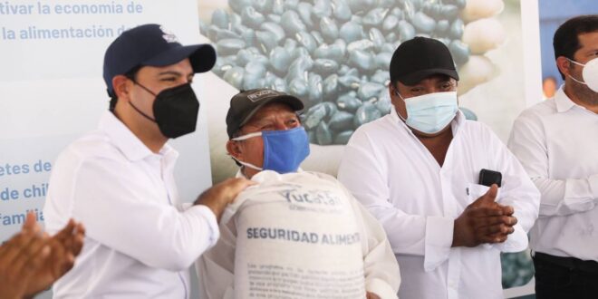 Al interior del domo del parque principal de esta demarcación, el Gobernador entregó 400 sacos de semilla de frijol Jamapa y 150 paquetes de semilla de chile habanero de la variedad Kisín, que en esta población benefician a un total de 550 familias, cuyas siembras resultaron dañadas por los fuertes vientos y lluvias que trajo el fenómeno natural en agosto pasado.