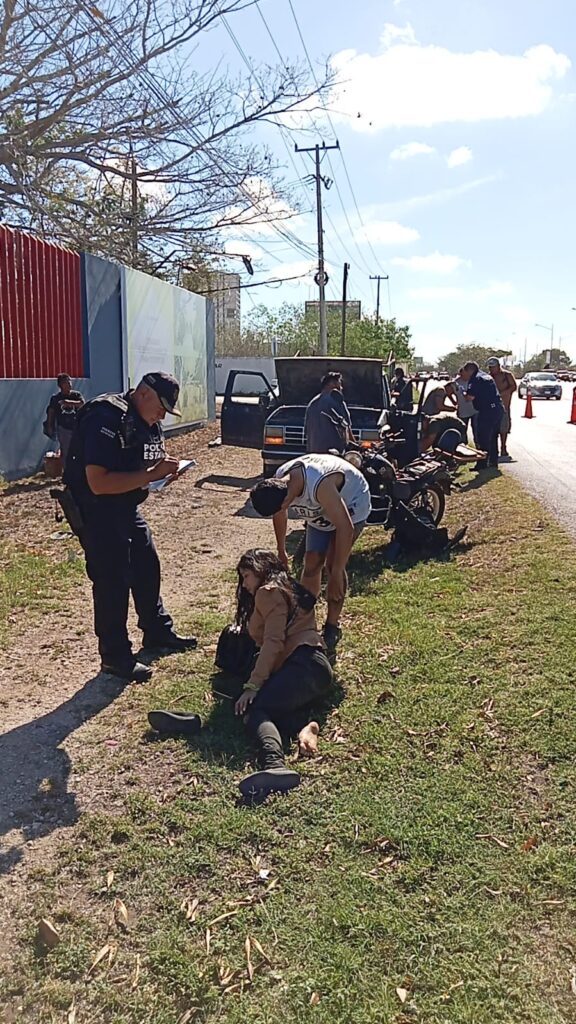 MÉRIDA, Yuc., 11 de marzo 2026.- Un aparatoso hecho de tránsito ocurrido en el periférico norte de Mérida dejó como saldo tres personas lesionadas, dos de ellas con fracturas expuestas, luego de una cadena de impactos que involucró a una motocicleta, un automóvil y una camioneta.