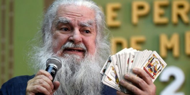 El Brujo Mayor, de 79 años, pidió a los reporteros que hicieran preguntas sobre cualquier tema a las que respondió como si se tratara de una charla entre amigos, a veces consultando una carta del tarot que tomaba al azar de la baraja y mostraba a las cámaras.