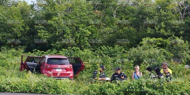 Hunucmá, Yuc., a 19 de agosto 2023.- Una familia de turistas extranjeros que volvía a la capital yucateca a bordo de una camioneta Nissan Xtrail, terminaron su paseo en la cuneta de la vía federal Mérida-Tetiz.