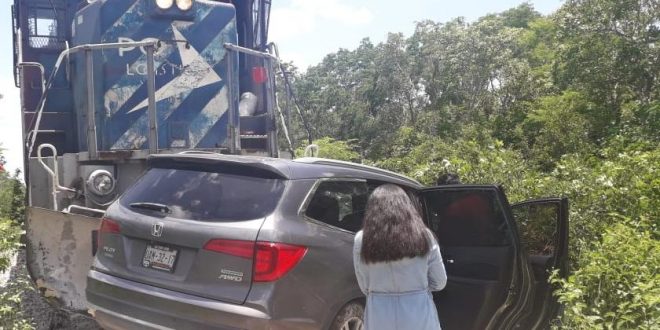 Los turistas nacionales, que viajaban en una camioneta Honda Pilot, fueron arrastrado por la locomotora en la vía Halachó-Maxcanú cuando su conductor pretendía ganarle el paso.