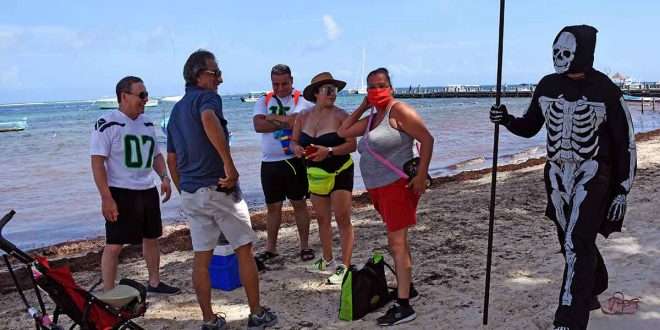 CANCÚN.- Ahí viene… es un sujeto vestido con un disfraz de calaca. Se acerca a grupos de turistas que llegan a Puerto Morelos, para advertirle de los riesgos latentes por el Covid-19.
