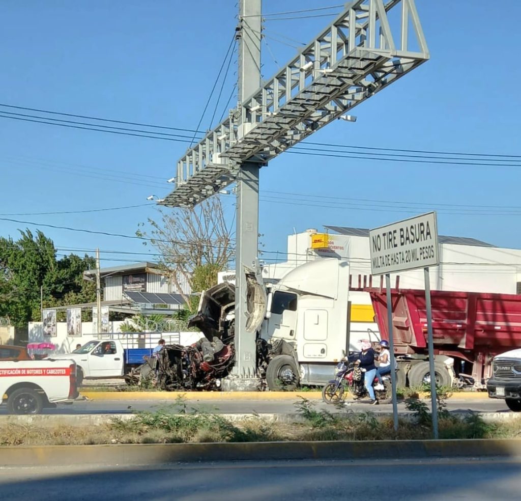 Asimismo, el armatoste arrastraba un remolque tipo tolva avanzaba de oriente a poniente sobre ese tramo y al estar a la altura de la calle mencionada perdió el control del volante y se fue a la derecha, se subió al camellón que divide el carril de la lateral, y se impactó de frente contra un poste metálico tipo bandera.