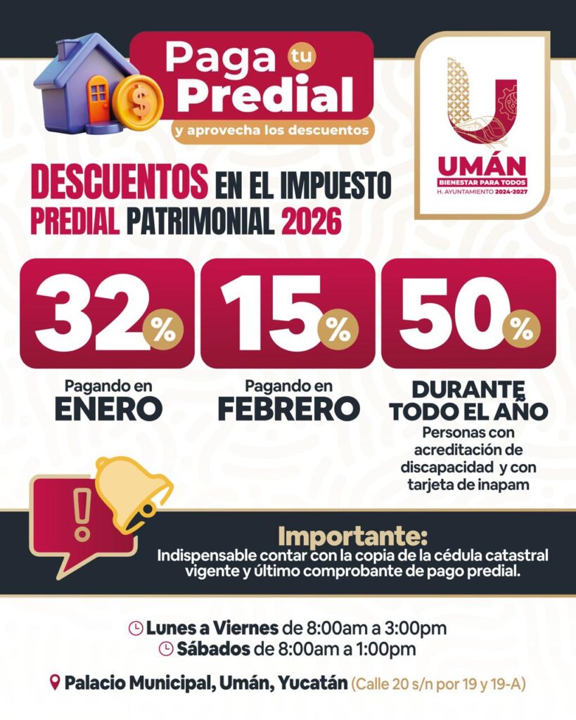Umán, Yucatán, 2 de enero de 2026.- El Ayuntamiento de Umán habilitó el pago del Impuesto Predial 2026 en línea, con el objetivo de facilitar el cumplimiento de esta contribución municipal, evitar filas y acercar los servicios públicos a la ciudadanía.