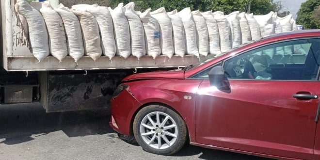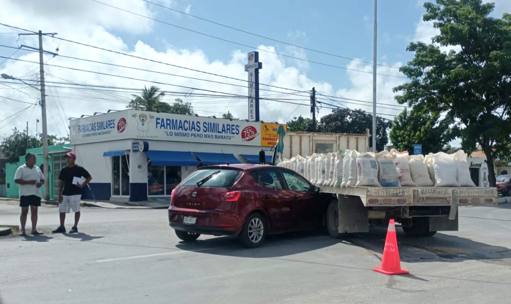 Mérida, Yuc. a 19 de septiembre.- Debajo de unos de los costados de un camión materialista quedó un automóvil tipo Ibiza, la mañana de este miércoles, en la calle 50 con 173 de la colonia Plan de Ayala Sur, en el camino que lleva a Xmatkuil.