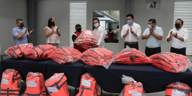 PROGRESO, 19 de agosto de 2022. – El H. Ayuntamiento que preside el alcalde Julián Zacarías Curi, en coordinación con la Secretaría de Desarrollo Social, hizo entrega de un centenar de kits de chalecos salvavidas a igual número de pescadores como parte del programa “Apoyos Microyuc a Pescadores Ribereños”.