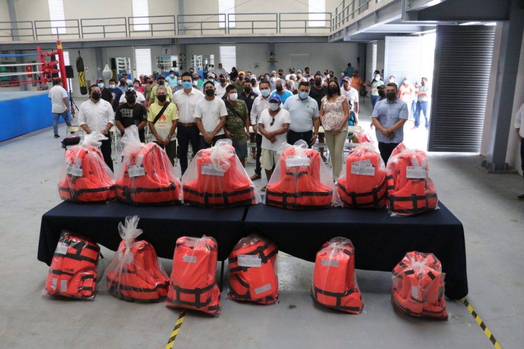 Cada kit constó de tres chalecos salvavidas, beneficiando así a 100 pescadores ribereños de la cabecera municipal y sus comisarías; de los cuales, 60 son de Chelem, Chuburná y Chicxulub Puerto; y 40 de Progreso.