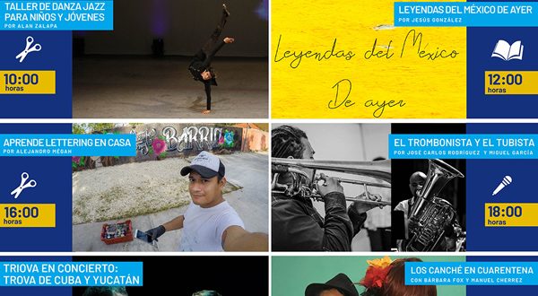 “Aprendiendo Guitarra desde casa con Lalo Aguilar”; Carolina Castillo Ceballos con “Transforma tus jeans como un Diseñador de moda”; David Poot Fuentes con “Taller de edición de fotografías con celular”; Irving David Cetz Pacheco con “Instrumentos Virtuales para la Producción Musical en Home Studio”; Luis A. Rincón Sandoval con “Procesos alternativos de fotografía monocromática en casa: Cianotipia”; Israel Leal Mex con “Jaraneando con el flaco Miguel” y Araceli Navarro Ramírez con “Técnica de faldeo de Jalisco”.