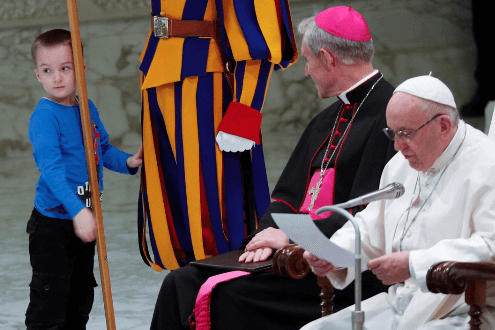 Wenzel Eluney estaba sentado en las primeras filas de la sala, donde se sitúan los enfermos, y en un momento determinado escapó de su madre y subió a la zona donde estaba sentado el pontífice celebrando la audiencia y se puso a jugar alrededor de uno de los guardias suizos y a correr por ese espacio.