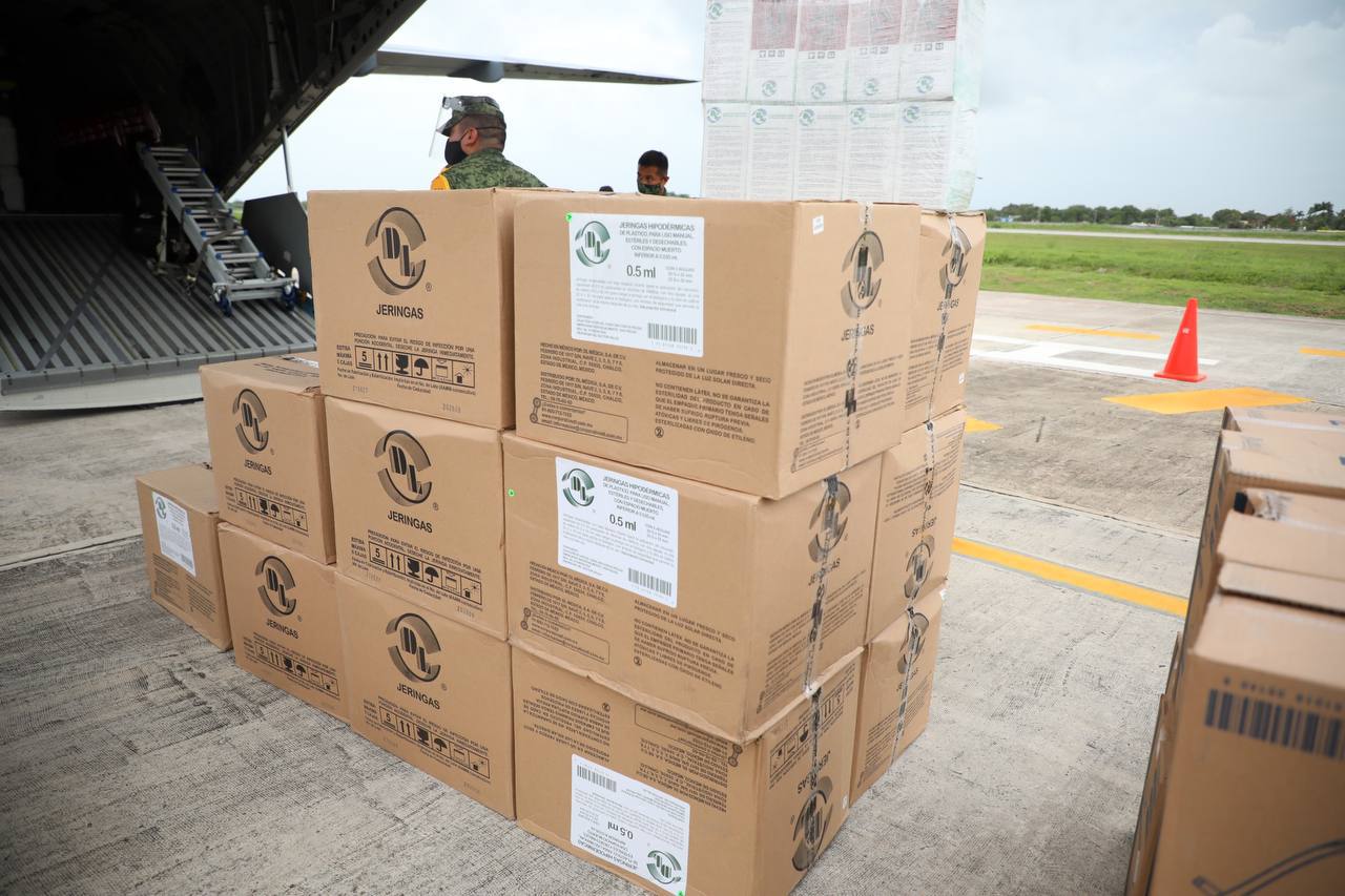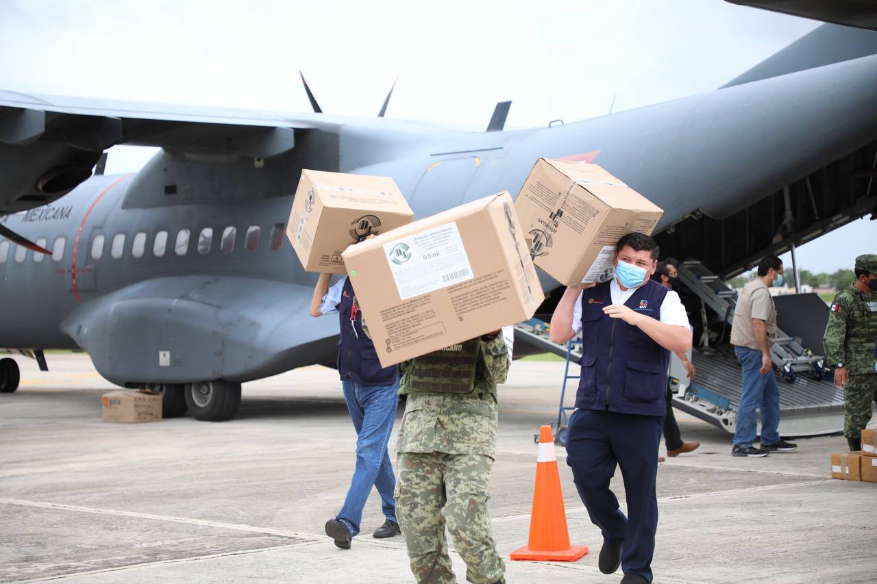 En el arribo del nuevo lote de vacunas también estuvieron presentes el Coronel Florentino Ruiz Sánchez, Comandante del 7 Batallón de Ingenieros de Combate y el Capitán Primero Fuerza Aérea Especialista en Electrónica y Aviación José Guadalupe Olvera Valencia.