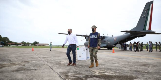 En el arribo del nuevo lote de vacunas también estuvieron presentes el Coronel Florentino Ruiz Sánchez, Comandante del 7 Batallón de Ingenieros de Combate y el Capitán Primero Fuerza Aérea Especialista en Electrónica y Aviación José Guadalupe Olvera Valencia.