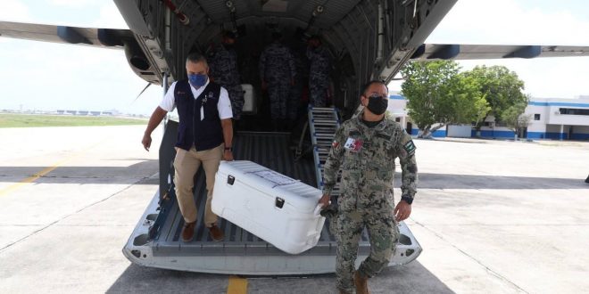 Acompañado del coordinador Estatal para la Vacunación Covid-19, capitán de Corbeta Carlos Gómez Montes de Oca, el funcionario constató la descarga de las vacunas e insumos, a cargo de personal del Ejército, el cual se colocó en un camión thermoking de la SSY, para su traslado al almacén, desde donde se distribuirán para su aplicación.