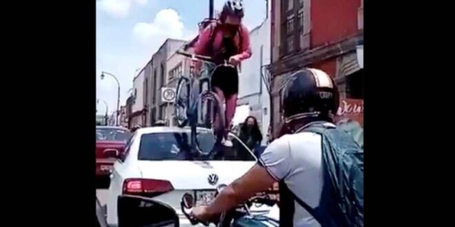 En el video sew observa el moemnto en el que una ciclista repartidora de Didi pasa por encima de un vehículo, debido a que el automovilista no respetó la ciclovía en el centro histórico de Querétaro; “el auto resulto dañado”, reporta el posteo en Twitter.