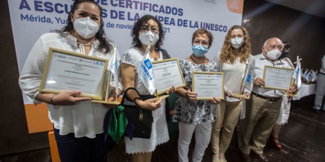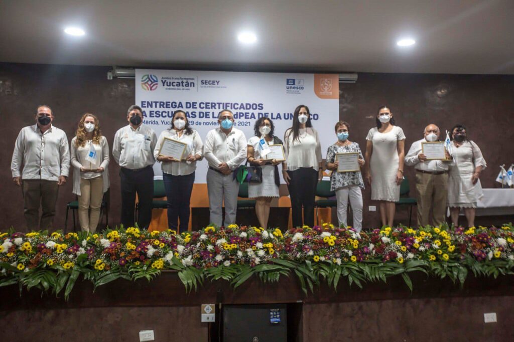 Mérida, Yucatán, 30 de noviembre de 2021.- Por haber diseñado proyectos orientados hacia el respeto al medio ambiente y la construcción de una cultura de paz, dentro y fuera de las aulas, cuatro planteles de Yucatán obtuvieron certificados como integrantes de la Red del Plan de Escuelas Asociadas (RedPEA) de la Organización de Naciones Unidas para la Educación, la Ciencia y la Cultura (Unesco).