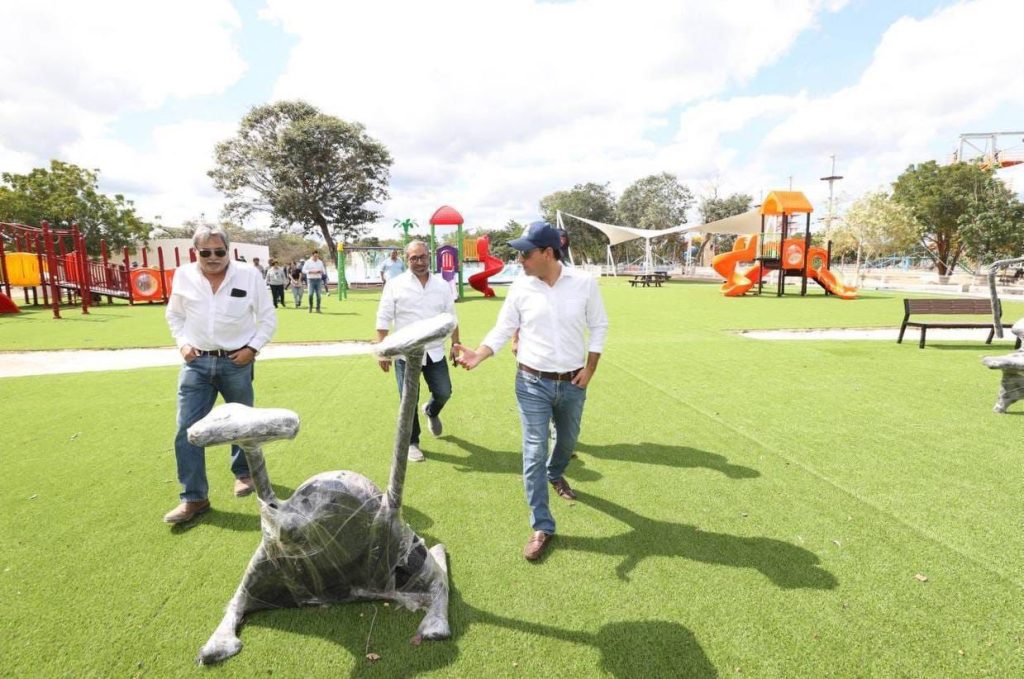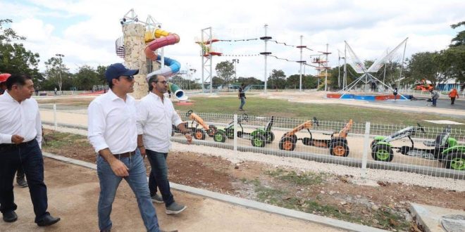 Esta mañana, Vila Dosal supervisó el importante avance de los trabajos de remodelación y modernización de este espacio que se encuentra en la colonia San José Tecoh, donde recorrió todos los atractivos con los que contará, como el nuevo parque acuático, área de juegos infantiles, gimnasio de boxeo, caja de bateo, campos de futbol, cancha de fut 7 techada, área de deportes extremos y campos de béisbol.