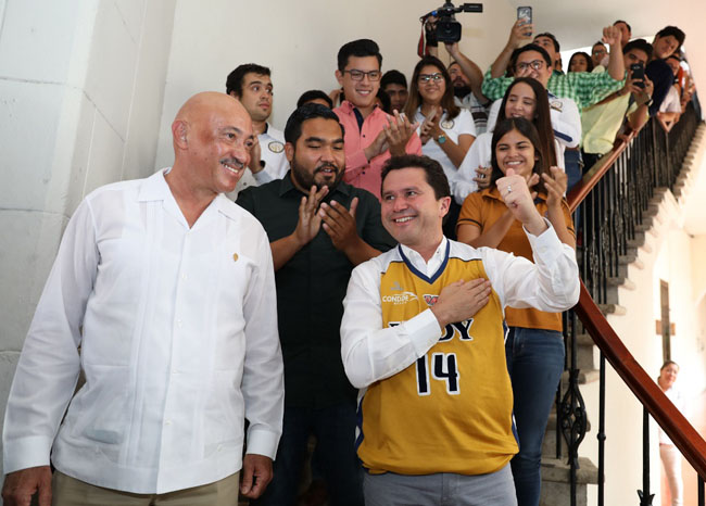 ¡Sahuí, bienvenido a casa!, expresó un alumno cuando el abanderado iniciaba su intervención y exponía su visión de Yucatán en el auditorio “Manuel Cepeda Peraza” del edificio central de la máxima casa de estudios.