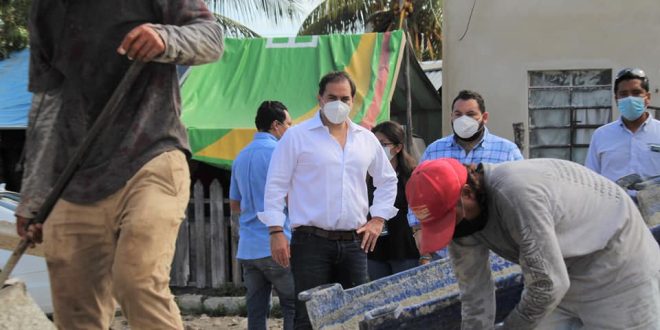 Progreso, Yucatán a 03 de marzo de 2021. La calle 58 por 37 y 39 de la colonia Francisco I. Madero se encuentra cerrada debido a los trabajos que está realizando el Ayuntamiento de Progreso en coordinación con las empresas “Constructora Alianza” y “Mezgom” en aceras, tanto del lado poniente como oriente de dicha vía; trabajos que supervisó el alcalde Julián Zacarías Curi esta mañana.