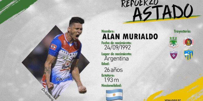 Venados FC anunció este martes la llegada del delantero argentino Alan Guillermo Murialdo quien será la punta de lanza que pidió el técnico Sergio Orduña para enfrentar el torneo Clausura 2019 del Ascenso MX que comienza este viernes 4 de enero.