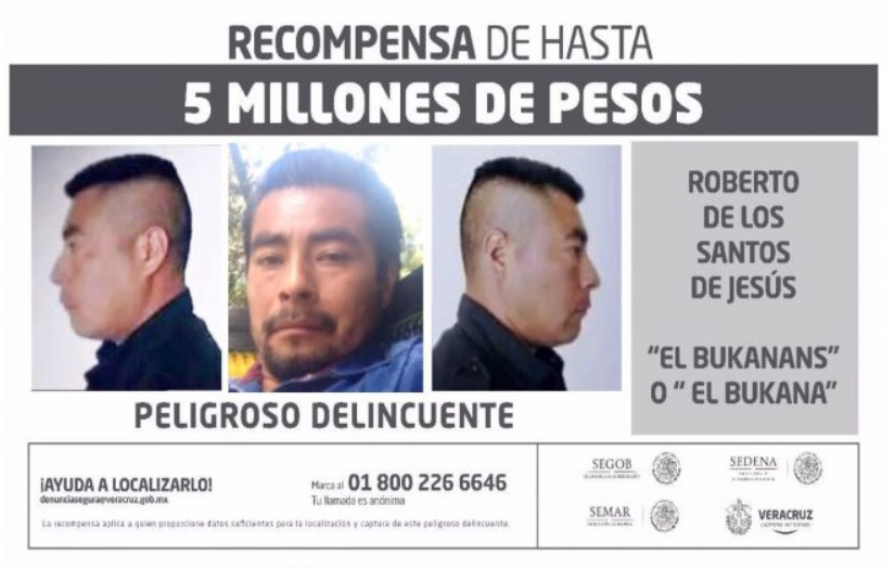 “El día de hoy hemos acordado subir la recompensa de hasta cinco millones de pesos a quien aporte información que nos permita detener a Roberto de los Santos de Jesús, alias “El Bukanas” o “El Bukana”, con datos de inteligencia muy precisos, hemos podido determinar que quienes están operando en la zona, fundamentalmente es una estructura encabezada por Roberto de los Santos de Jesús alias “El Bukanas”, quien se hace llamar líder de un grupo Sangre Nueva Zeta SNZ, colaboran con él en actividades delictivas”, dijo el gobernador de Veracruz, Miguel Ángel Yunes.