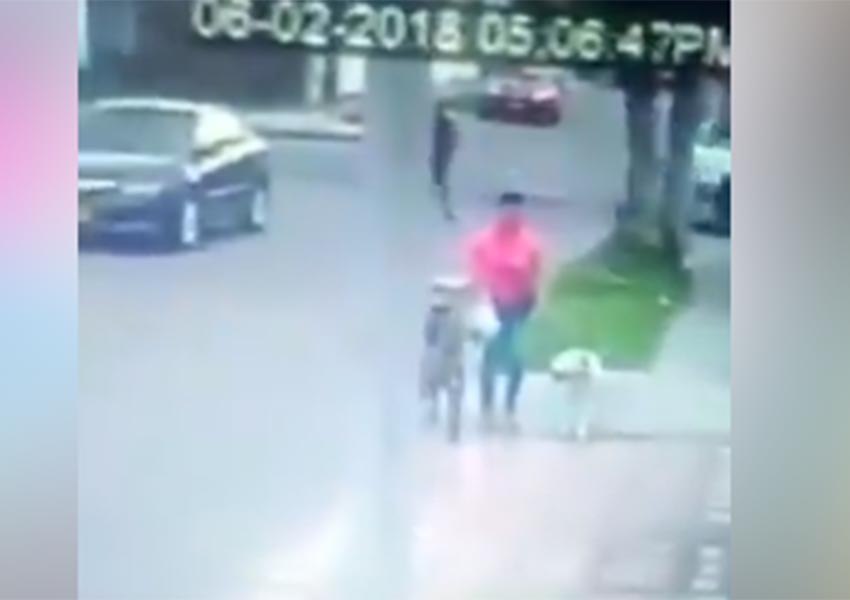 Un video difundido en la cuenta de Facebook Conexión Puebla capta el momento en el que una mujer camina por la calle, en una mano lleva su bicicleta y en la otra la correa con su perro.