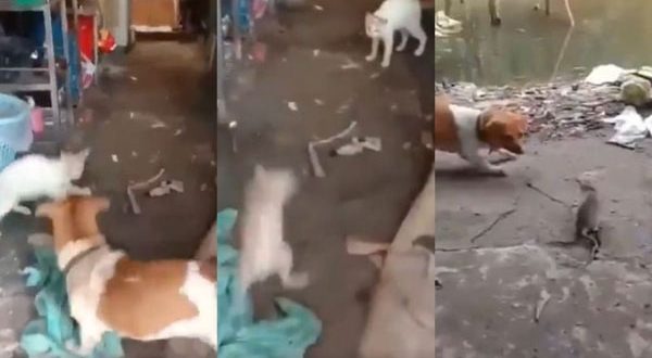 La agilidad de la rata y su valentía le valieron la vida, ya que con grandes saltos reta al perrito que está a punto de atraparla, y con su velocidad logró esquivar los ataques del felino que terminó brincando de miedo.