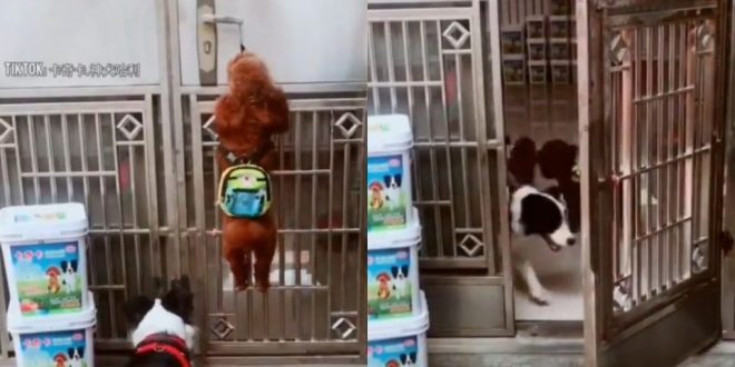 Un perrito con una pequeña mochila en su espalda, se volvió viral después de que aprendió abrir la puerta para sus amigos perros e “ir a la escuela”.