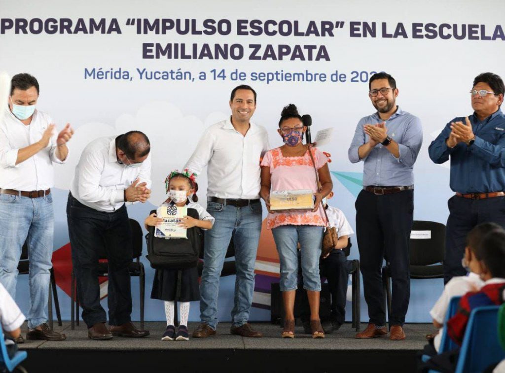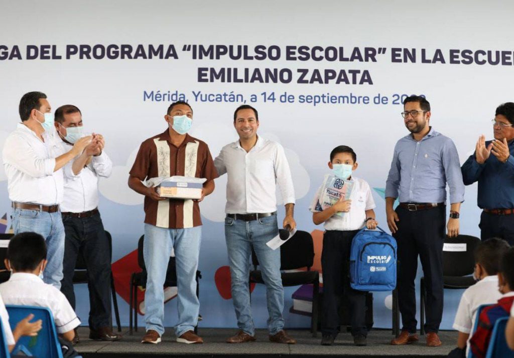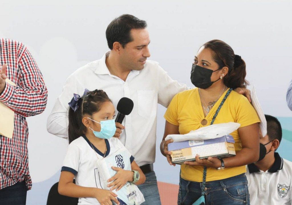 Acompañado de los estudiantes, docentes, padres de familia y representantes sindicales del magisterio, Vila Dosal recordó que además de contribuir a la economía de las familias de Yucatán, este esquema ayuda a más de 2,000 familias de 160 talleres de Huhí, Homún, Hunucmá, Cuzamá, Tekit, Mama, Ticul, Tekax, Kanasín, Cansahcab, Acanceh, Espita y Mérida, que se encargan de elaborar las camisas, mochilas y los zapatos que incluye este esquema.